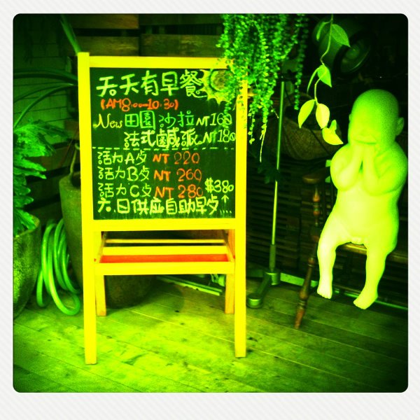 裡面跟日光大道健康廚坊一樣,強調自然有機食材,自助早餐提供美式及中式早餐。中式早餐有稀飯、肉鬆、鹹蛋、醃蘿蔔、炒青菜、豆漿等;美式早餐有香腸、培根、炒蛋、水煮蛋,還有日光大道的吐司、法國麵包、有機水果醬、香草奶油醬,加上水果、四方牧場牛奶、有機咖啡、有機花果茶...店內佈置很多藝術品,氣氛不錯,還有小包廂可供預訂。
